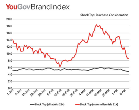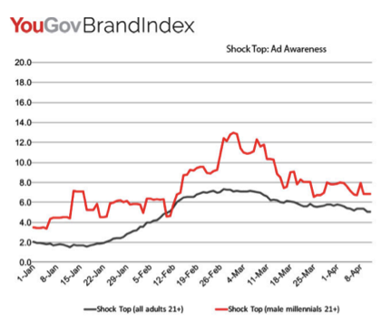 “Since the campaign first launched, Shock Top has maintained elevated ad awareness among adults (21+) well beyond their initial Super Bowl lift. The ad is resonating with millennial men (21–34), peaking with ad awareness of 13% on March 1st.”
