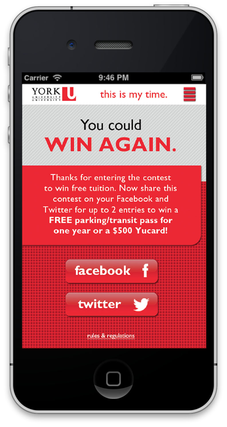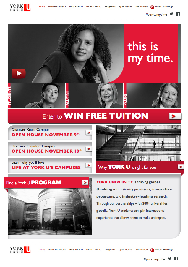 We developed a microsite that served as a ‘vision exchange’ whereby prospective students were exposed to all of the campaign creative (student, faculty, alumni) and could learn more about York, open house dates and submit their vision for a chance to win free tuition. The contest was expanded to engage current York students with a chance to win free tuition. In the second year the contest was enhanced to encourage active sharing via social media.