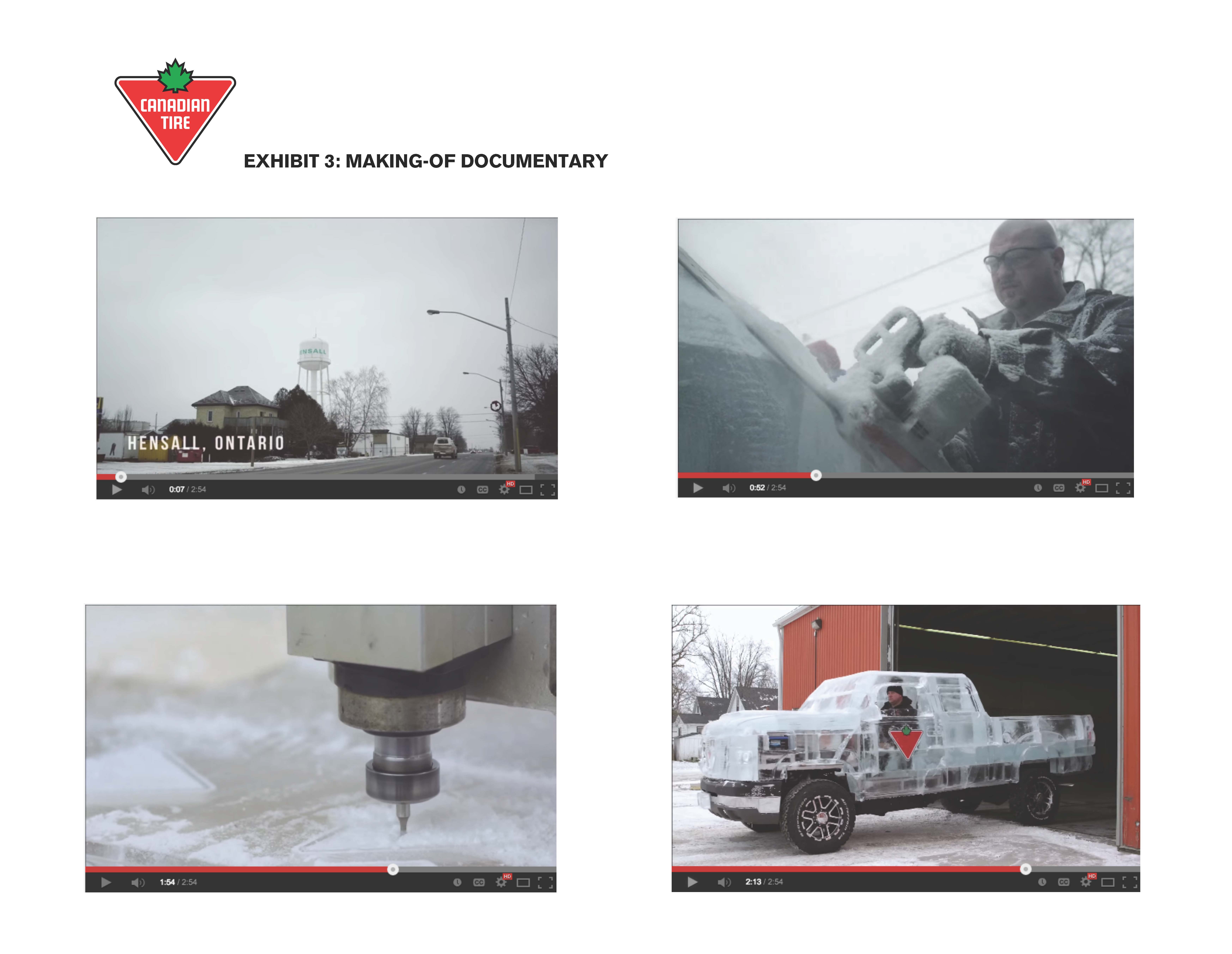 A truck made of ice, frozen batteries, dry ice, -40ºC – very quickly we realized that the Canadian public might claim this to be one big hoax. To stop them, we produced a making-of documentary (Exhibit 3) that used footage capturing every stage of the development. This documentary became an integral part of the campaign.